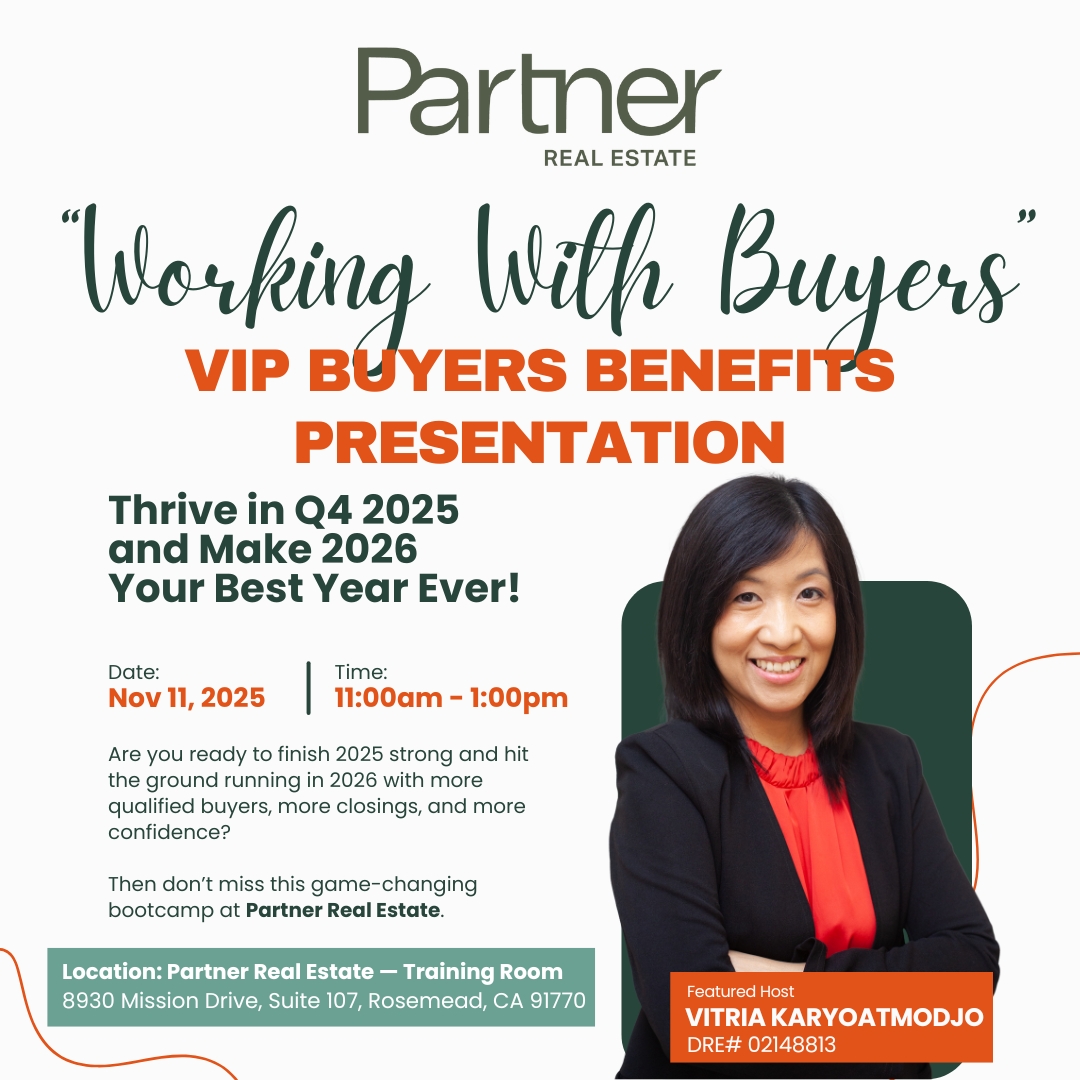 Date: Tuesday, December 2, 2025Time: 11:00 AM – 1:00 PMLocation: Partner Real Estate — Training Center8930 Mission Drive, Suite 107, Rosemead, CA 91770