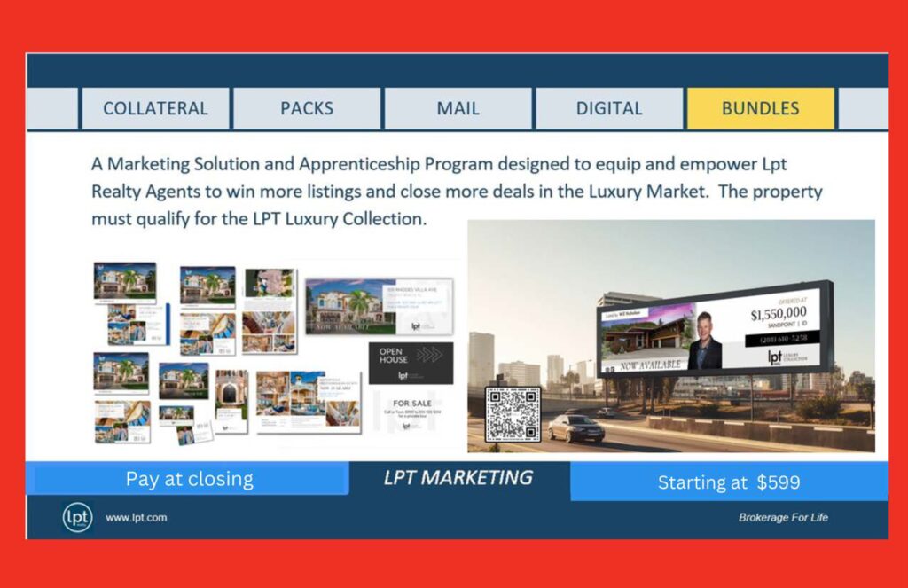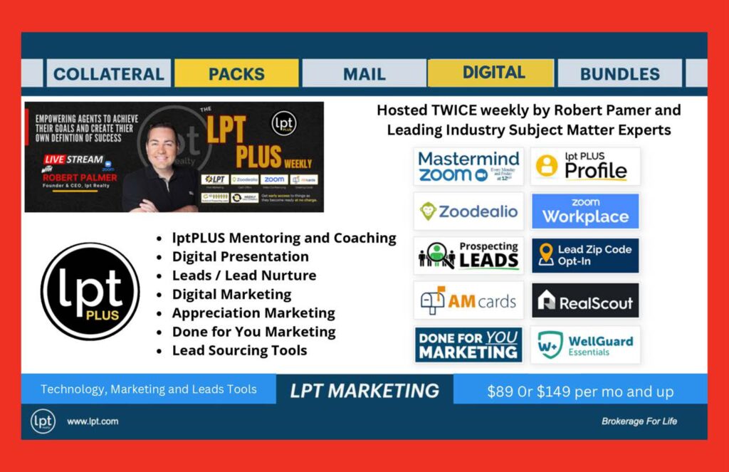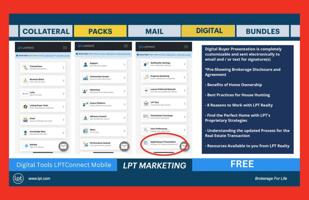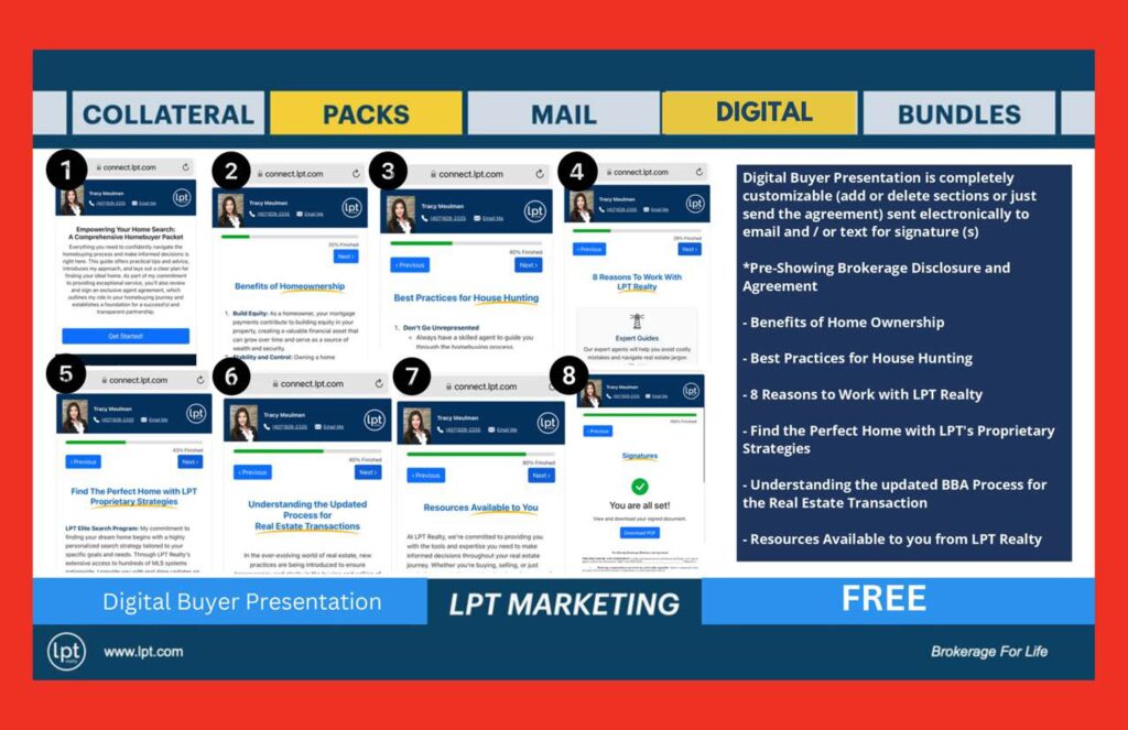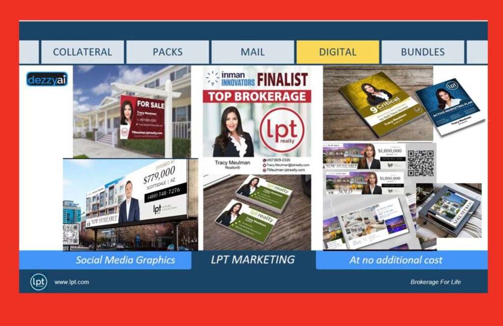 At LPT Realty, the goal is simple: give agents an unfair advantage through better marketing, better technology, better education, and better compensation. The broader LPT collateral system shown in the uploaded deck includes print, digital, presentations, direct mail, text capture, and lead magnets designed to move consumers from awareness to advocacy.