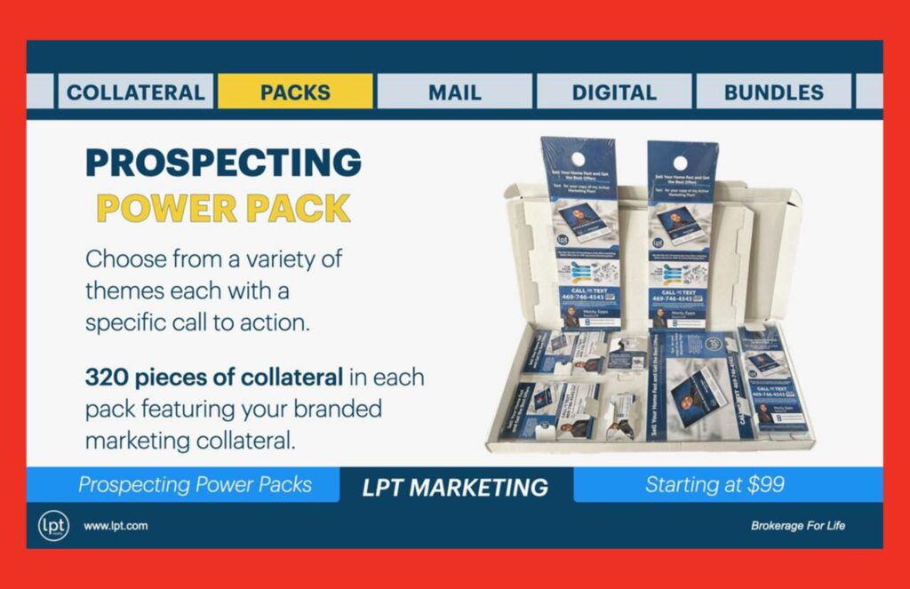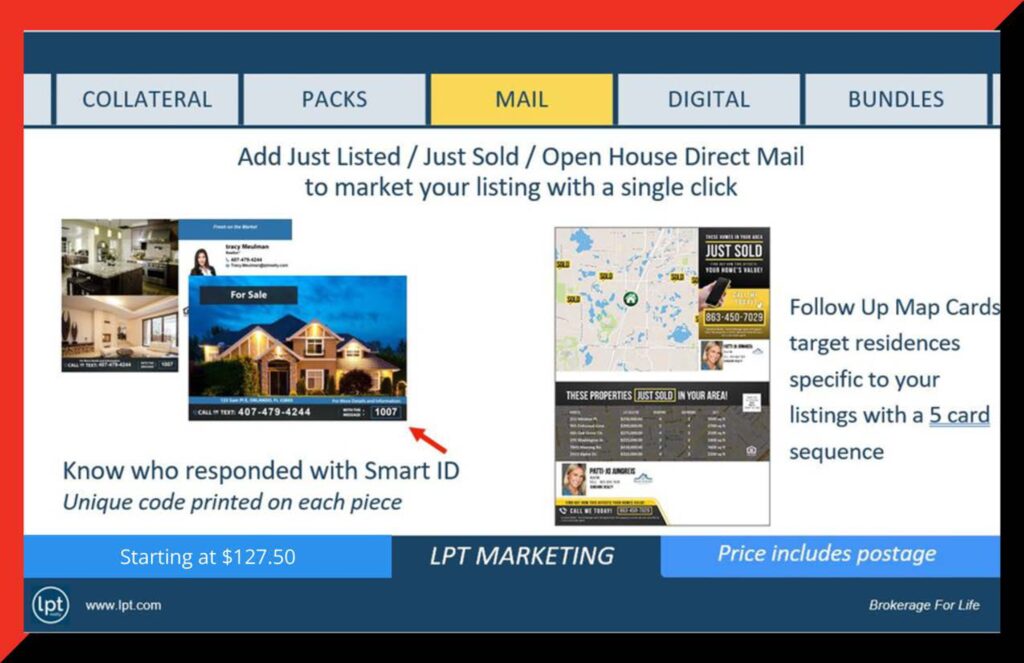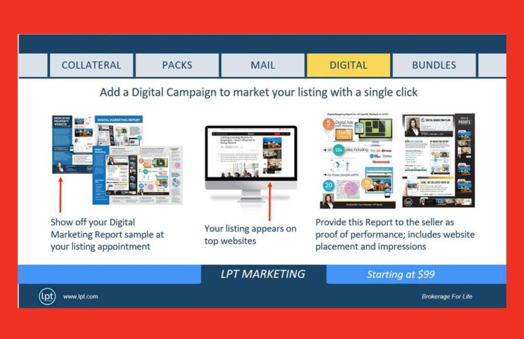The LPT Collateral Marketing System is designed to be branded for the agent and powered by the brokerage, with options across print, presentations, direct mail, digital, and luxury marketing.