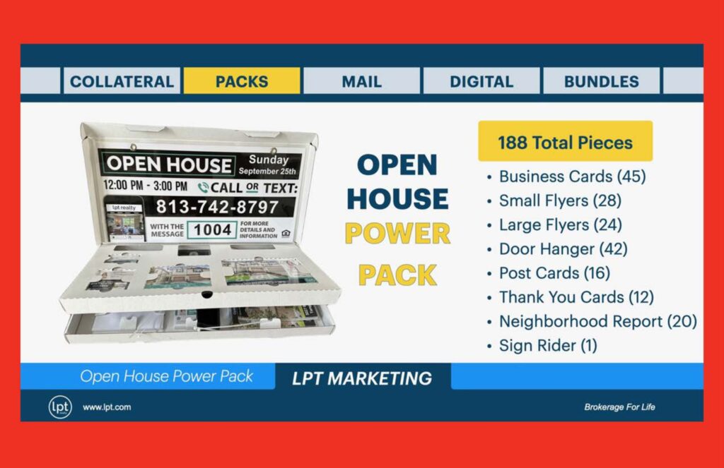 That is why the LPT system includes serious print support. The uploaded deck shows Just Listed and Open House Power Packs with 188 total pieces, including business cards, flyers, door hangers, postcards, thank-you cards, neighborhood reports, and a sign rider.