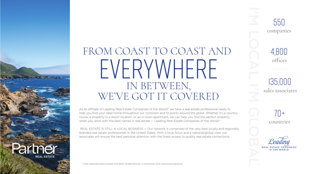 When it comes to buying or selling a home, you deserve more than just a real estate agent — you deserve a powerful network working for you. Partner Real Estate is proud to be a member of Leading Real Estate Companies of the World® (LeadingRE), a prestigious global community of 550 real estate firms across 70+ countries, with over 134,000 professionals and 4,800 offices worldwide.