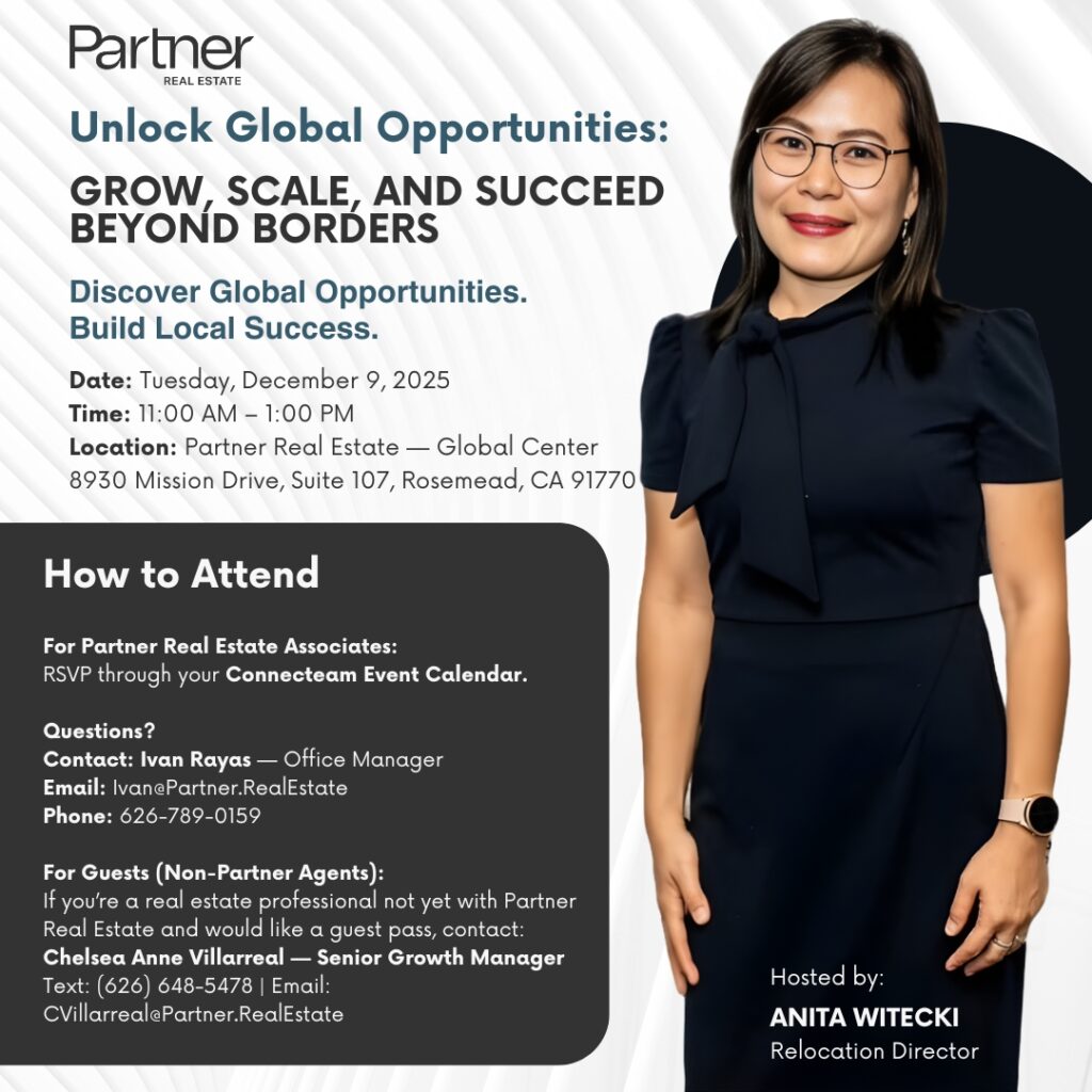 On Tuesday, December 9, join Relocation Director Anita Witecki, for the Partner Real Estate x LeadingRE Bootcamp, where we’ll unlock the global opportunities available to every Partner Real Estate associate. Whether you’re a new agent or a seasoned producer, this training will show you how to grow, scale, and position your business to serve clients locally and globally.